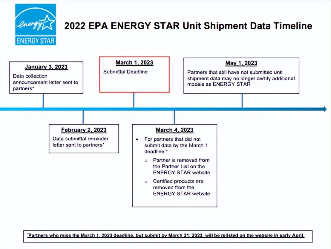 2023年1月,美国EPA通知所有的 ENERGY STAR 产品品牌所有者合作伙伴都必须每年报告其认证产品单位出货数据,以确定 ENERGY STAR 产品的市场渗透率并评估该计划的整体绩效。2022年度shipment data数据收集截止日期为2023年3月1日。如未能在截止日期前提交单位出货数据,将导致合作伙伴的认证产品从能源之星网站认证产品列表中删除,其名称也会从合作伙伴列表中删除。仍未能在2023年5月1日之前提交其单位出货数据的合作伙伴可能无法申请能源之星认证。