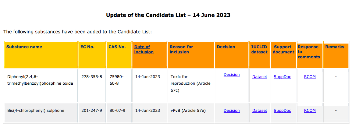 2023年6月14日,欧洲化学品管理局(ECHA)正式公布将(2,4,6-三甲基苯甲酰基)二苯基氧化膦、4,4'-二氯二苯砜两项化学物质纳入第29批高度关注物质(SVHC)清单。